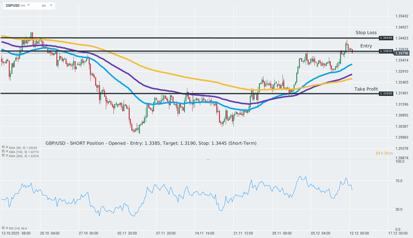 LSEG recommends a short position on GBPUSD with an entry at 1.3385, a target at 1.3190, and a stop loss at 1.3445. Source: xStation5