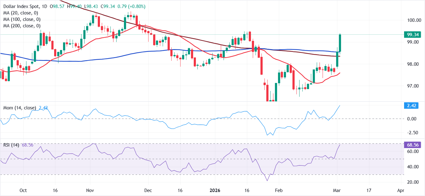 Valeria Bednarik, Chief Analyst at FXStreet, notes: “Demand for the USD pushed the DXY to its highest since mid-January, when the index topped at 99.50. The bullish trend is clear on the daily chart, as the DXY has run beyond its 100-day and 200-day Simple Moving Averages (SMAs), both directionless and converging at the 98.40-98.60 price zone. The same chart shows technical indicators head firmly north, well into positive territory, without signs of upward exhaustion.”