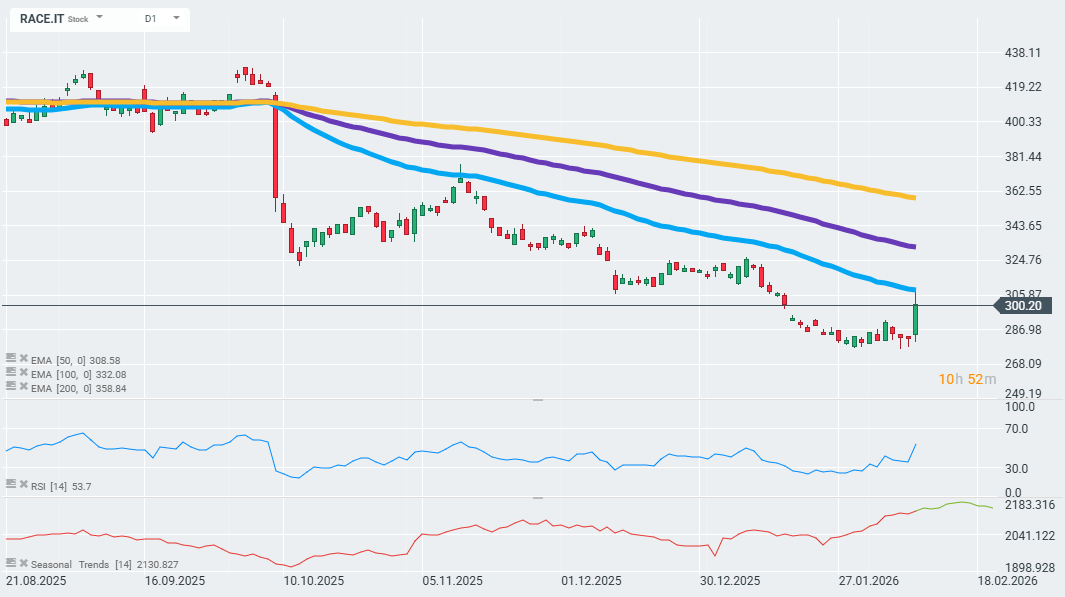 Ferrari posted very strong results, both for the quarter and for the whole of 2025: earnings per share in Q4 (USD 2.49) and revenues (USD 2.098 billion) clearly exceeded market expectations, growing by approximately 9% and 13% year-on-year, respectively. For the full year, revenue reached €7.15 billion (+7%), EBIT rose 12% to €2.11 billion, and the operating margin rose to a very high 29.5%, with an EBITDA margin of 38.8%. Particularly impressive was the increase in industrial free cash flow to €1.54 billion, up 50% year-on-year, highlighting the strength of the business model and discipline in volume management. The company looks to the future with great confidence, targeting approximately €7.5 billion in revenue and an EBITDA margin of 39% for 2026, with an order book filled until the end of 2027, confirming the very strong demand for the Ferrari brand.