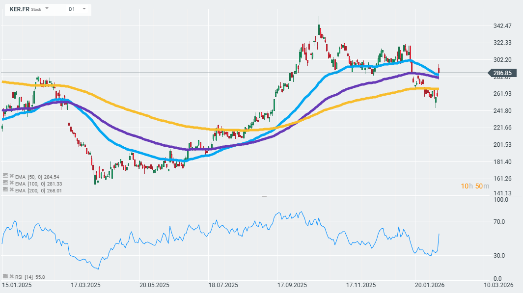 Kering reacted strongly on the stock market (share price up approx. 14%) after publishing better-than-expected results for Q4, particularly at Gucci, and announcing an exceptional dividend of €1 per share following the sale of its beauty division. The results still show a significant deterioration: revenues fell, operating profit for 2025 declined by approximately one-third, the operating margin fell to 11.1%, and the group reported a small net loss from continuing operations. Gucci continues to record double-digit sales declines (–10% like-for-like in Q4), albeit slightly less than the consensus, while the better performance of YSL and Bottega Veneta offsets the weakness of other brands and higher one-off costs. Analysts emphasise that the report shows a “slight improvement”, but the key will be whether the new management can actually restore growth and improve margins in 2026-2027; more details are expected to be revealed at Capital Markets Day on 16 April.