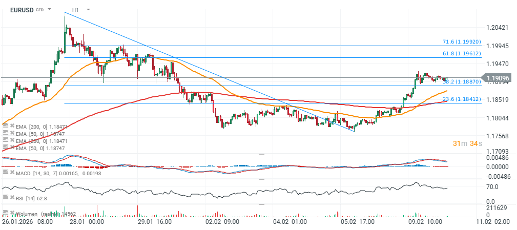 EURUSD is trading above the 38.2% Fibonacci retracement, while momentum indicators have cooled following the recent consolidation.