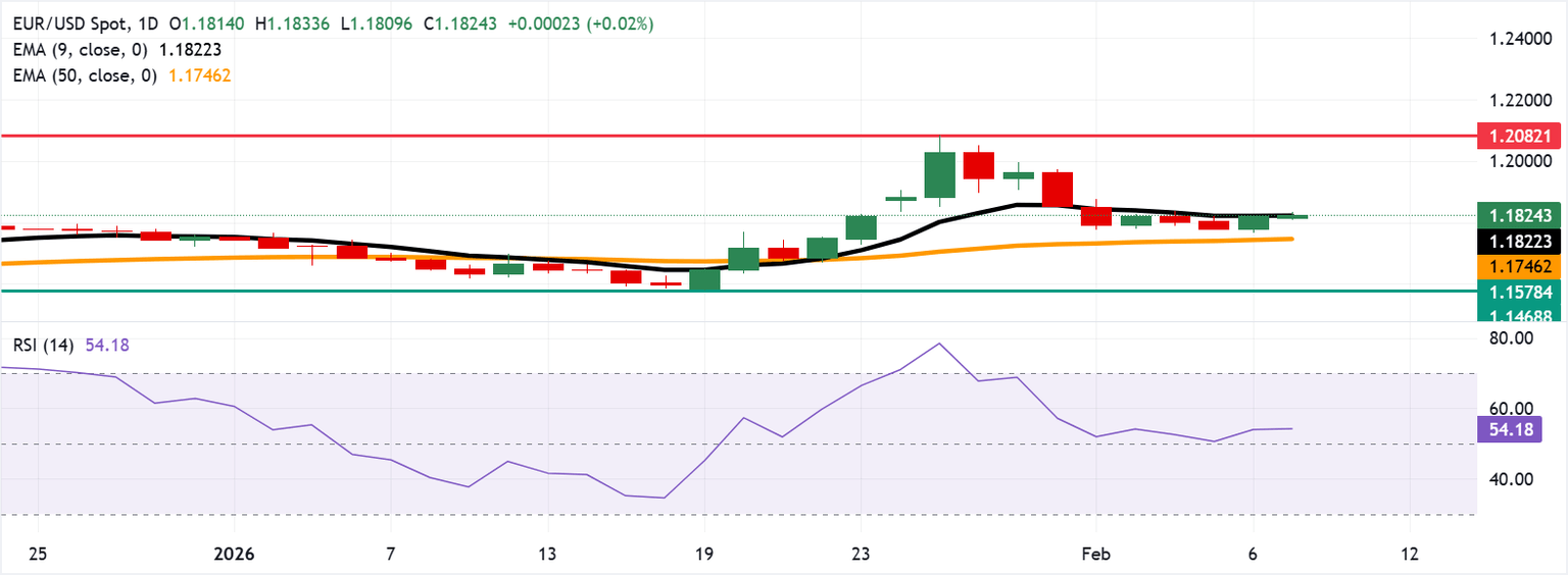 - EUR/USD trades near a flattening nine-day EMA, while a rising 50-day EMA supports a mild bullish bias.