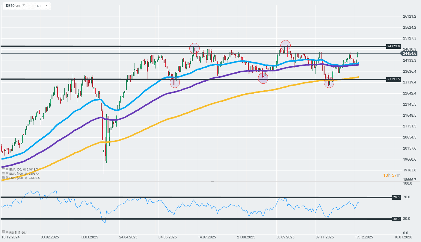 At the beginning of the week, the DAX stabilized close to Friday’s closing levels of around 24,450 points. However, this does not change the fact that the current bullish momentum, which managed to push the contract above the 50-day exponential moving average (blue curve on the chart) and the 100-day exponential moving average (purple curve), is, from a technical perspective, an indication of a short-term upward trend prevailing on the instrument. In the medium term, however, it is worth bearing in mind that the contract has been moving in a relatively narrow consolidation channel since May this year, which is why the local highs set by this zone may be the next important resistance points. Source: xStation