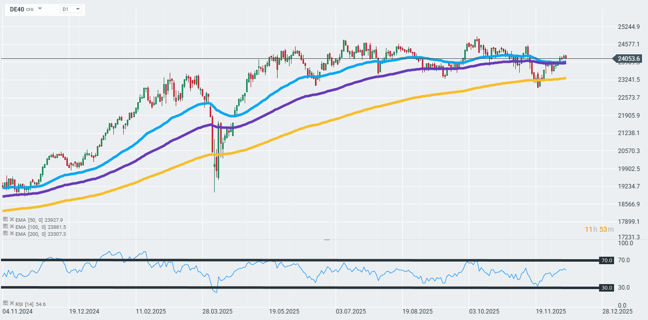 Today, the DAX is losing its bullish momentum, which managed to push the contract above the 50-day exponential moving average (blue curve on the chart) and the 100-day exponential moving average (purple curve), which, from a technical perspective, were significant barriers indicating a short-term downward trend on the instrument. -day exponential moving average (purple curve), which, from a technical perspective, were significant barriers indicating a short-term downward trend in the instrument. However, breaking above this zone negates this scenario, and if DE40 remains above the aforementioned curves, the contract could theoretically start a new upward impulse with a range up to the recent historical highs on the contract. Source: xStation