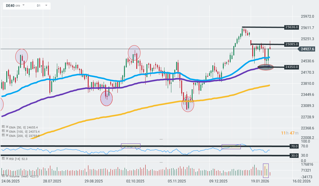 The DE40 contract erased all of its daily gains after briefly breaking above the upper limit of the recent consolidation area near 25,100 points. From a technical point of view, however, the instrument still maintains a short-term upward trend (50-day EMA, blue curve).