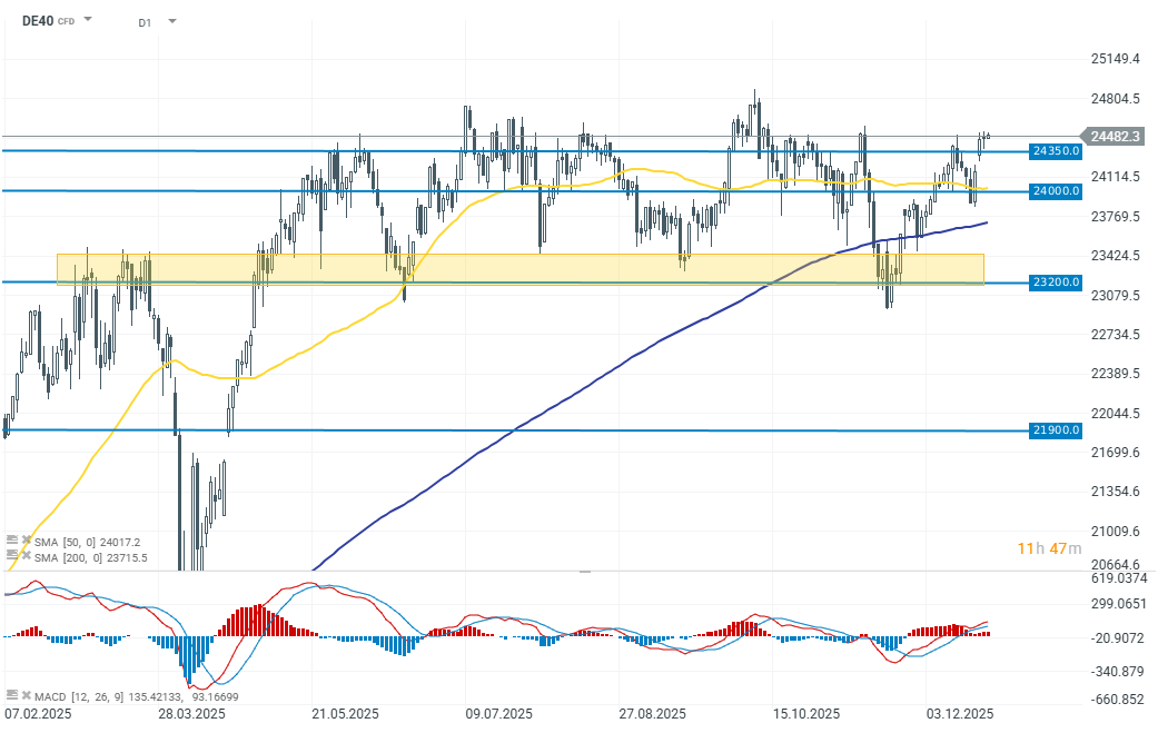 Germany’s DAX index remains within a long-term consolidation channel. This time, however, prices have managed to return to testing the upper boundary around the 24,500-point zone.