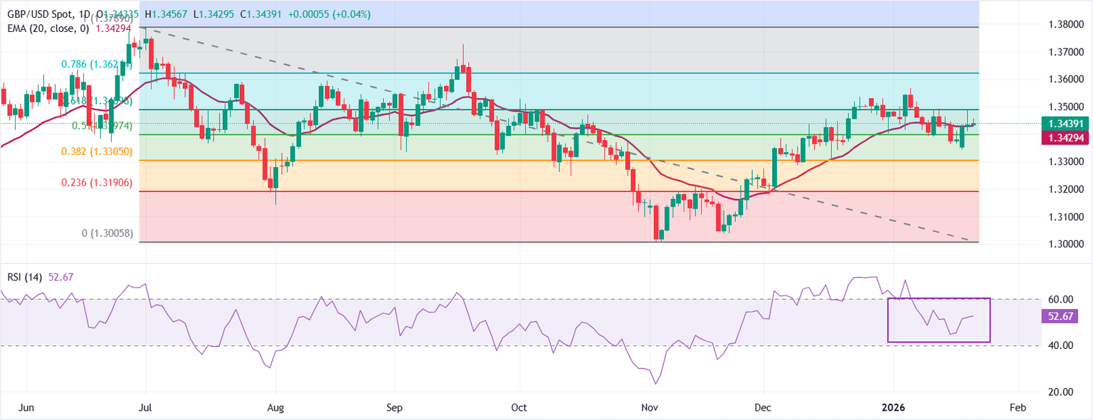 GBP/USD trades broadly sideways near 1.3440 at the time of writing. Price holds marginally above the 20-Exponential Moving Average (EMA) at 1.3429, which has flattened after a steady climb, signaling consolidation. A sustained close above the 20-day EMA would keep the near-term bias tilted to the upside.
