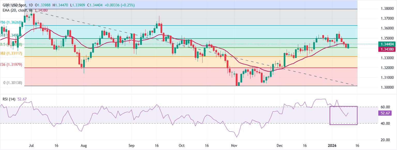 GBP/USD trades higher, at around 1.3443 at the time of writing. The 20-day Exponential Moving Average (EMA) rises and sits at 1.3438, with price holding just above it, which supports a bullish tone.
