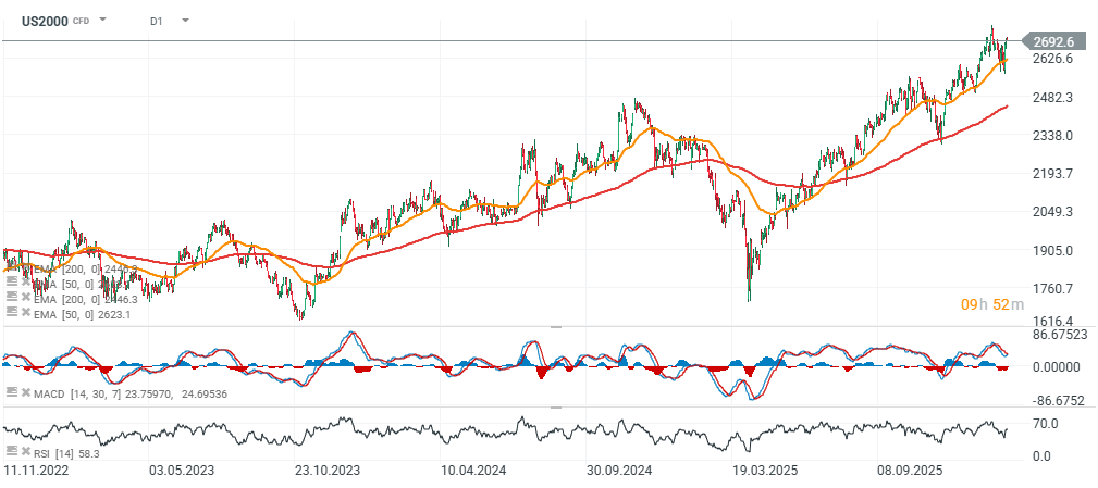 US small- and mid-cap index futures Russell 2000 (US2000) are edging slightly lower today, but the contract is still roughly 50 points below its all-time high. Data from small businesses (much smaller than the companies included in the Russell 2000) came in a bit weaker than expected and remain below the survey’s 52-year average (98). This index is an important barometer of the US domestic economy, as it tracks the condition of small, often family-owned businesses that account for around 40% of total employment in the United States.