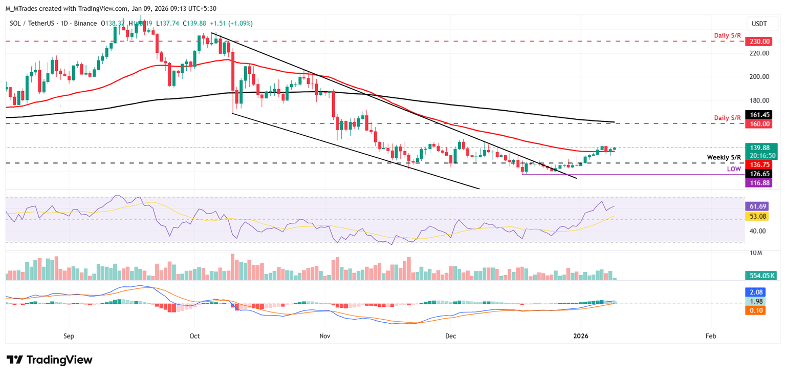Solana price closed above the weekly resistance level at $126.65 on January 2 and rose nearly 12% in the next five days, closing above the 50-day Exponential Moving Average (EMA) at $136.75 this week. However, SOL’s price declined slightly on Tuesday, retested the 50-day EMA, and rebounded the next day. As of Friday, SOL is trading higher above $139.