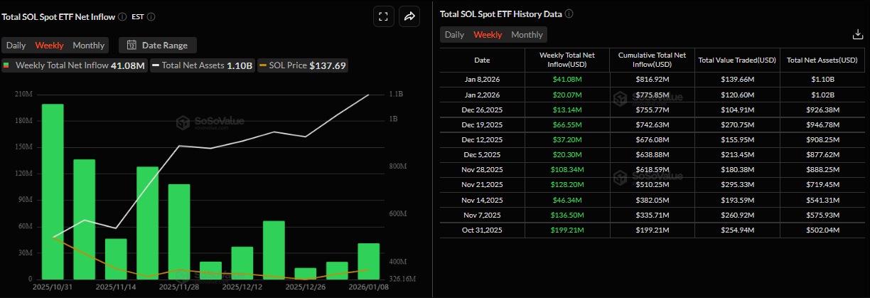 Institutional demand for Solana remained strong so far this week. SoSoValue data shows that spot Solana ETFs recorded a net weekly inflow of $41.08 million through Thursday, the highest weekly inflow since mid-December, and continuing its weekly streak since its launch on October 28. Moreover, the total net assets reached $1.10 billion so far this week, suggesting rising institutional demand. If inflows continue and intensify, SOL could see a price rally.