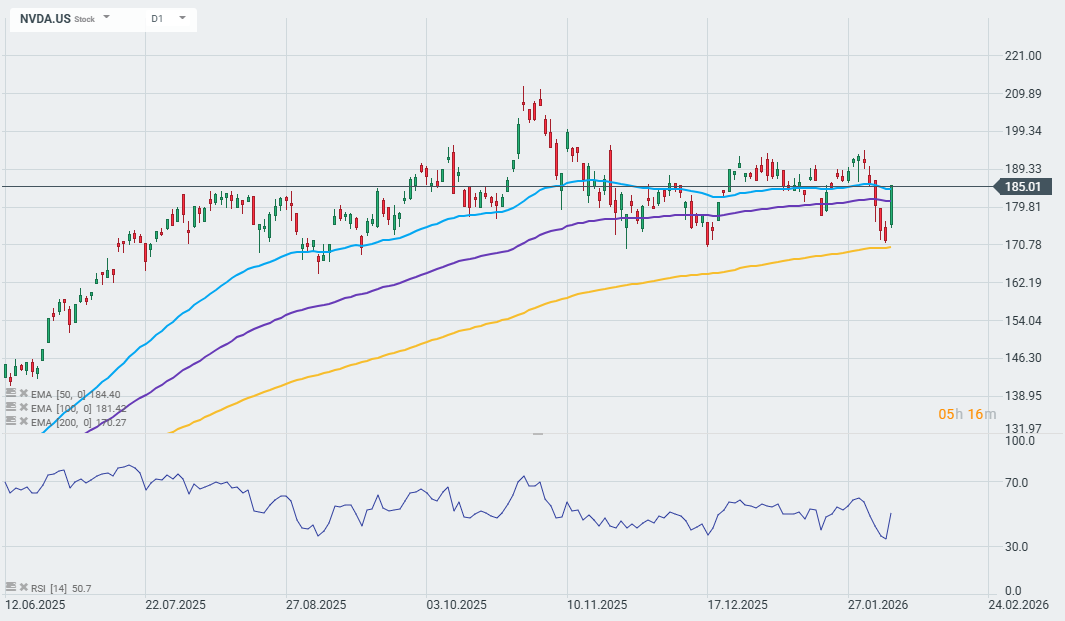 NVIDIA (NVDA.US) shares are up 7.3% today following comments by CEO Jensen Huang, who called the expansion of AI infrastructure a “once-in-a-generation opportunity” lasting 7-8 years. (Cloud computing giants such as Amazon AWS, Microsoft Azure and Google Cloud are building massive data centres for AI and are at the forefront of this boom.)