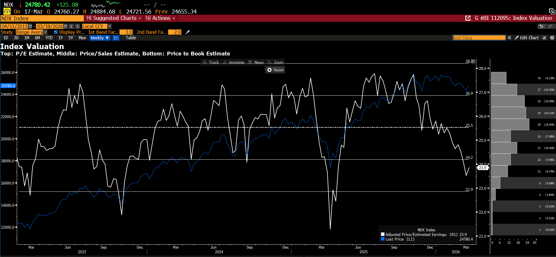 Looking at the historical range of the forward P/E ratio (based on 12-month forward estimates) for the Nasdaq-100 index, we can see that the ratio is currently fluctuating below one negative standard deviation of the range since 2023. Source: Bloomberg Financial Lp