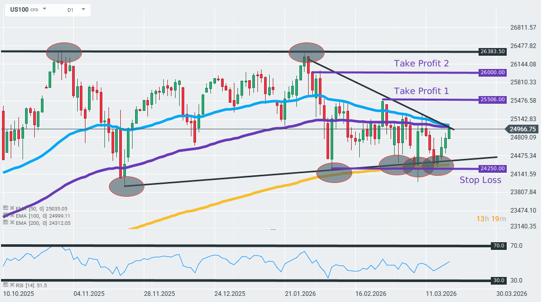 - The US100 is testing its 50-day exponential moving average