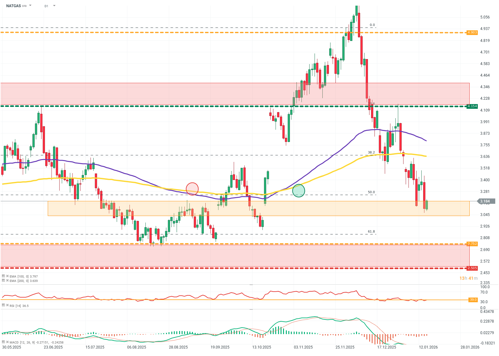 • The recommendation is based on technical analysis of the chart, particularly EMA averages, RSI, Fibonacci levels, and fundamental analysis of the natural gas market.