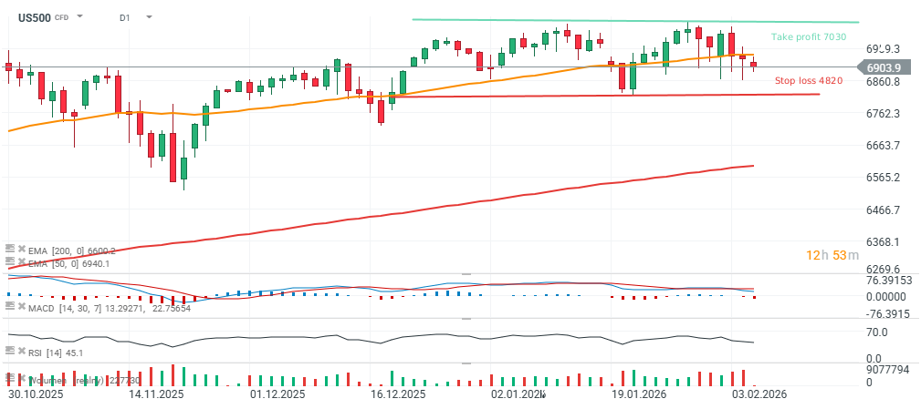Recent declines in US500 have been relatively sharp, but fundamentals for U.S. equities remain solid. The U.S. economy is performing relatively well, with inflation remaining fairly low not only in CPI data but also in the increasingly monitored Truflation indicator. Donald Trump has stated that the newly appointed Fed Chair, Kevin Warsh, intends to cut interest rates, while the S&P 500 earnings season has so far been positive overall, even if market reactions to individual company results have been mixed.