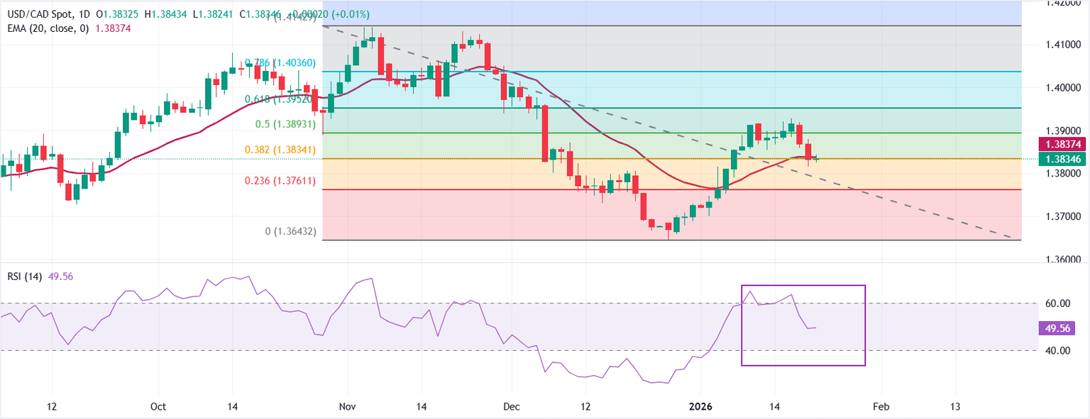 USD/CAD trades flat around 1.3834 as of writing. The 20-Exponential Moving Average (EMA) has flattened near 1.3837 after a steady drift lower and sits marginally above spot, capping rebounds. A close above the 20-day EMA would improve near-term traction, while failure to reclaim it would keep price action choppy.