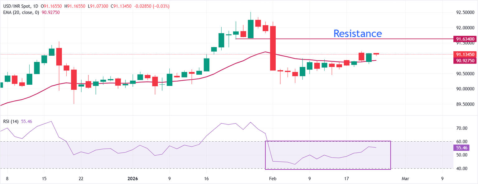 USD/INR trades marginally lower at open around 91.10. Price holds above the 20-day Exponential Moving Average at 90.9273, keeping a mild bullish bias.